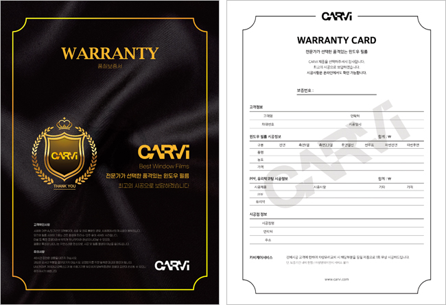 CARVi를 선택해주셔서 감사합니다. CARVi는 품질에 대한 자부심으로 제품의 정확한 품질 보증을 제공하고 있습니다. 시공 후 발급받은 보증 번호를 확인하여 품질 보증서를 조회 및 출력할 수 있습니다.